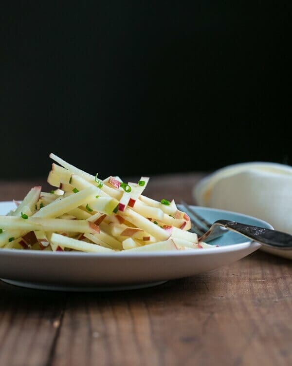 This refreshing apple manchego salad is a total fall treat! It stars apples and Spanish Manchego cheese cut into matchsticks, dressed simply with a bit of olive oil and chives. The way these ingredients are combined in such a simple way makes each shine! The way the apples and cheese are cut makes it hard to distinguish between the two – making it all the more fun to guess what will be part of each bite!