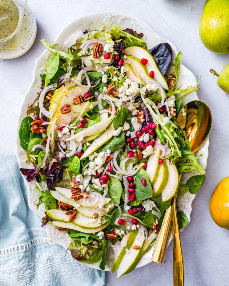 Here’s a dreamy fall salad if there ever was one: this brilliant Pear Salad! It’s a study in contrasts: fresh, juicy pear against funky gorgonzola cheese; bright pomegranate against savory shallot. Throw in some toasted pecans and cover it in tangy poppy seed dressing, and well: it’s absolutely irresistible.
