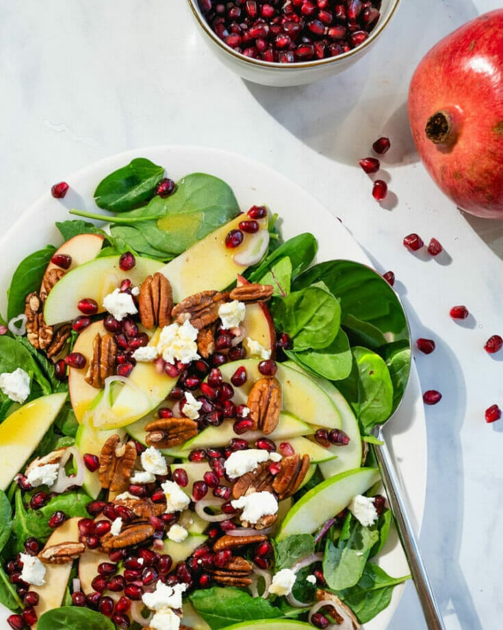 - Place the greens on a large platter or individual plates. Top with apple slices, candied pecans, goat cheese or feta crumbles, and pomegranate seeds or dried cranberries. Top with about 6 tablespoons of the dressing (or more as desired) and serve immediately. (To make ahead, keep all components separate with fresh ingredients and dressing refrigerated. Toss the apples with lemon juice to prevent browning. Bring dressing to room temperature and add all ingredients together directly before serving.)