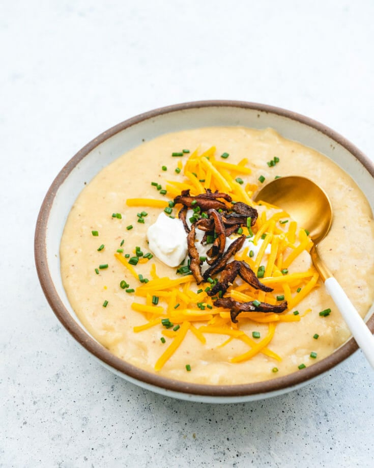 Who could pass up Instant Pot loaded potato soup? This one is creamy with intermittent potato chunks, using no heavy cream at all! Old Bay gives it an irresistible undertone. And it’s so easy to make: you don’t even need a blender! Like any good recipe, the best part is the toppings. Load it up with whatever you like: here we used shredded cheese, sour cream, chives, and smoky, salty vegan bacon.