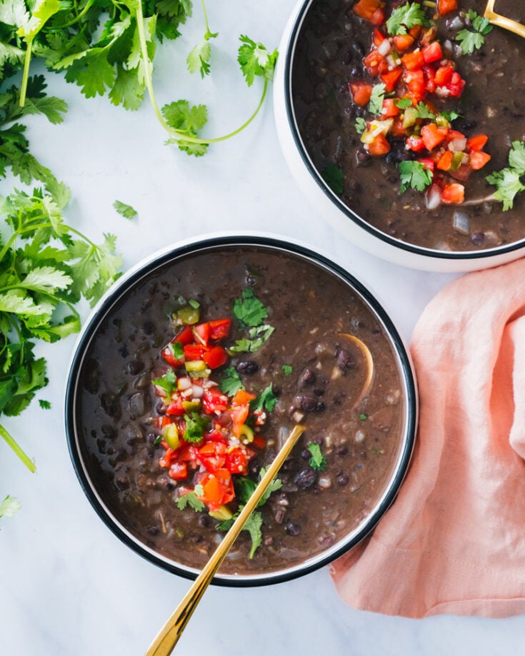 This Quick Black Bean Soup recipe is the ideal healthy and easy meal! Using canned beans makes it possible to whip up this tasty soup in 30 minutes. It’s creamy, garlicky and hearty, and a big bowl feels positively restorative. Top it with pico de gallo for a bright and zingy contrast in flavors.