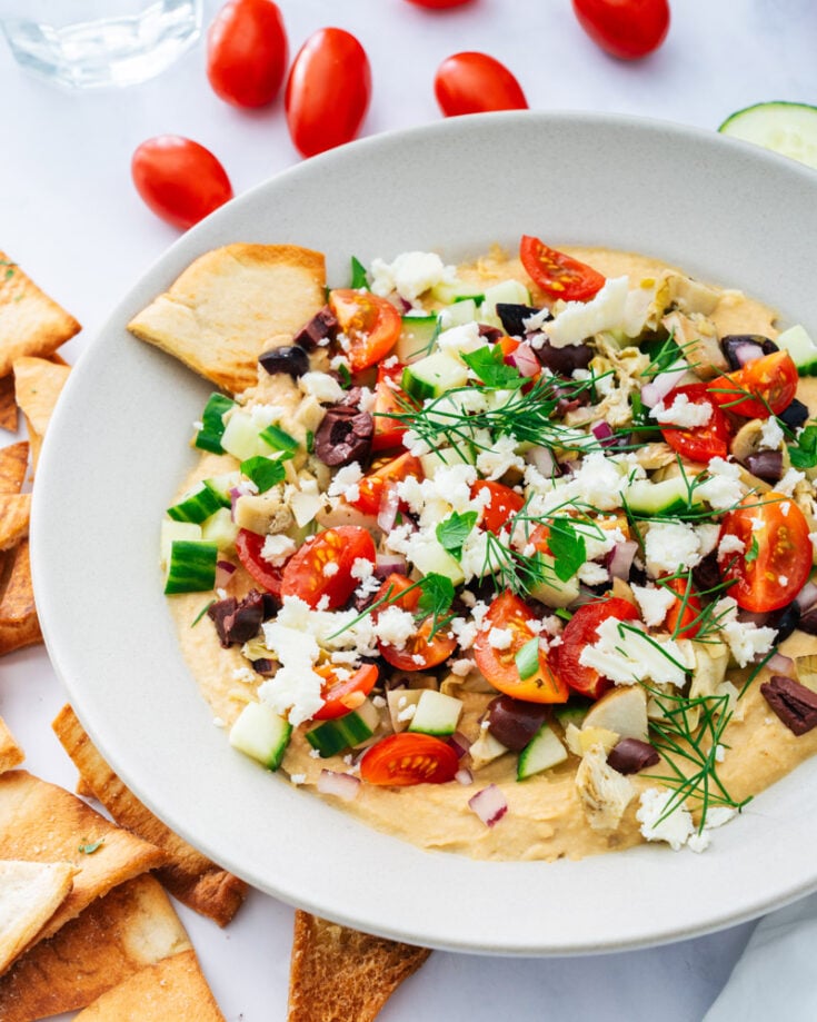 This simple concept requires no cooking at all: layer a dollop of hummus with crunchy veggies and serve with pita wedges. It’s easily customizable and you can make it super basic or fancier with easy additions of ingredients. It takes just 5 minutes to make this Mediterranean-style meal that’s bursting with creamy, tangy, crunchy, fresh, and savory flavors.