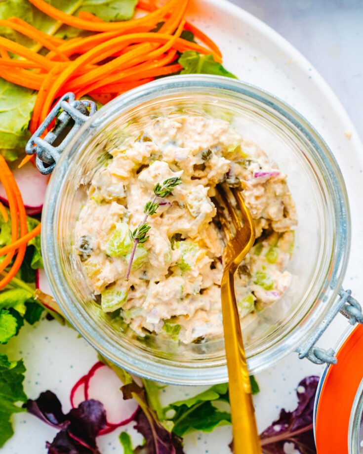 Here’s a fun way to mix up lunch with a spin on a deli-style favorite: Salmon Salad! It’s a creamy, crunchy mix of tangy flavors: just like Tuna Salad but using canned salmon. The flavor is savory and satisfying, and this recipe has a healthy spin with less mayo. It takes just 5 minutes, and works with crackers, in lettuce wraps, in a sandwich, and more.