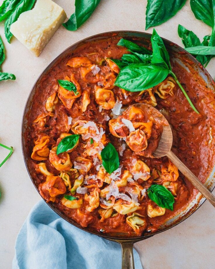 Here’s a delicious skillet to share: a tangy, garlicky tomato sauce, with a touch of richness from a hint of cream. It’s a great way to make them into a tasty vegetarian dinner idea. Make a half recipe or save the rest for leftovers.