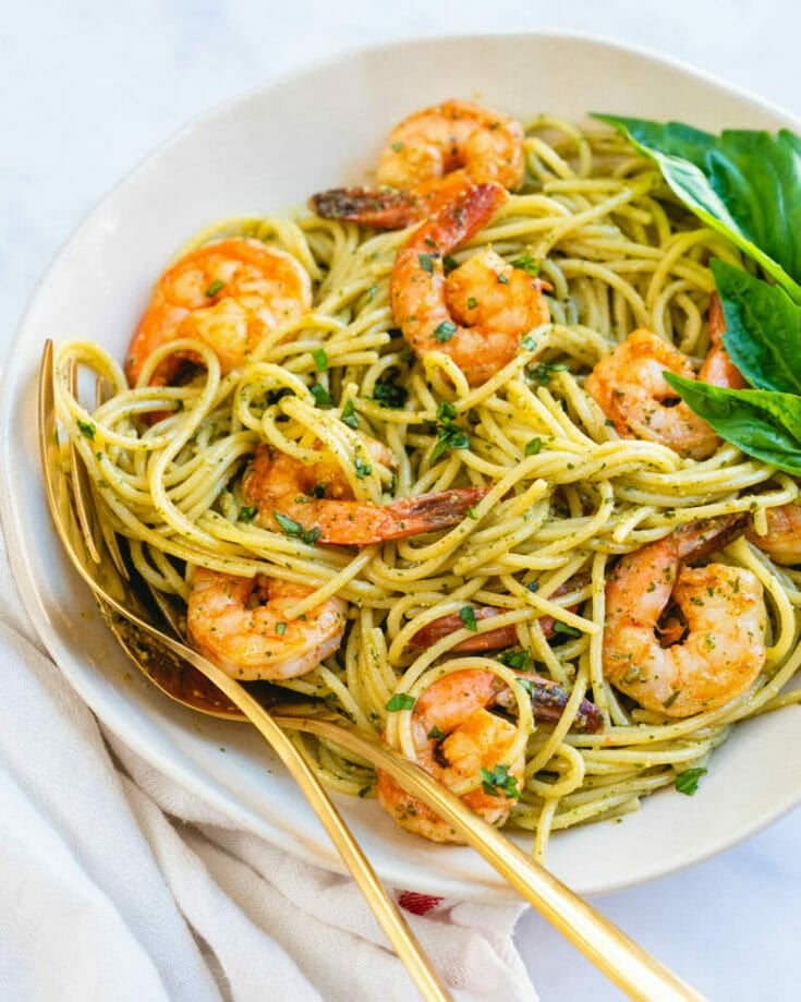 Here’s a fast and easy dinner recipe that’s always a hit: shrimp pesto pasta! Coat long noodles in silky basil pesto, then add juicy, succulent shrimp. Turns out, the garlicky pesto is the perfect pair for the savory pop of shrimp. It works just as well for a dinner party as a weeknight meal.
