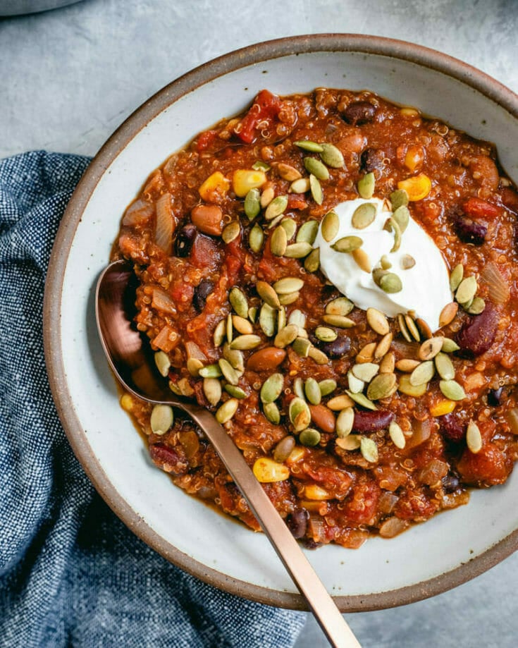 Loading up on plant-based protein is key to making plant based recipes filling! And this insanely-tasty healthy chili recipe is full of it: it's got a trio of protein-packed beans, quinoa and is topped with pepitas. It’s full savory, hearty flavor even though it’s meatless!