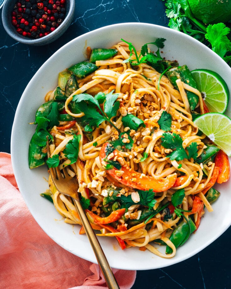 Need dinnertime inspiration? Cozy up to a bowl of these creamy, zingy peanut noodles! This plant based recipe comes together in less than 30 minutes. The peanut butter sauce is lusciously creamy, bursting with flavor from soy sauce, fresh lime juice and honey or maple syrup. Mix it together with luscious noodle strands and crunchy veggies and top with loads of fresh cilantro and crunchy peanuts.