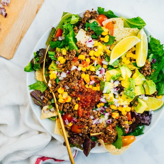 Vegan Taco Salad to the dinnertime rescue! This genius recipe comes to you by the magic of Walnut Taco Meat: a tasty way to make a plant-based version of ground beef. Walnuts, mushrooms and spices do a spot on job of simulating the savory goodness of meat crumbles. Add to that fresh veggies and a zingy sauce, and you’ve got a hearty meal that everyone will enjoy: including meat lovers!