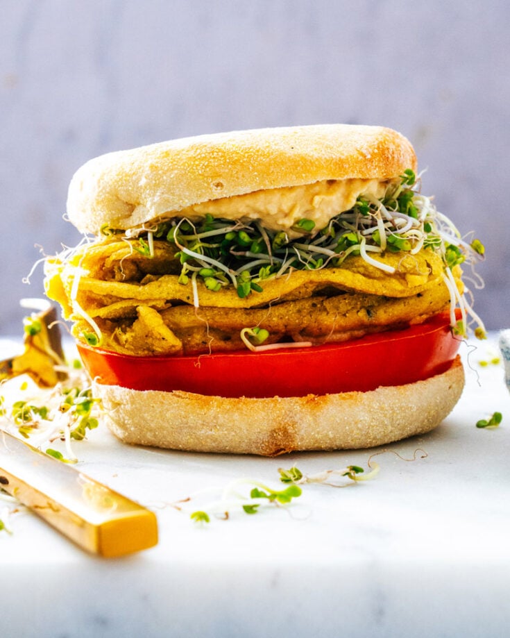 Looking for a plant-based way to start the day? Try this vegan breakfast sandwich! It takes just 5 minutes to whip up a savory chickpea pancake that surprisingly has a similar flavor and texture to scrambled eggs. Pile it high on a toasted sourdough muffin with tomato and avocado and it’s so satisfying: and totally plant based!