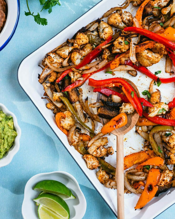 Let us present another favorite plant based recipe: these incredible sheet pan vegan fajitas! Everyone loves this meal, even meat eaters. It’s a great way to make a fun healthy dinner where no one notices there’s no meat! Roast up lots of veggies on a sheet pan with spices, and serve with refried beans and “guac-ish”.