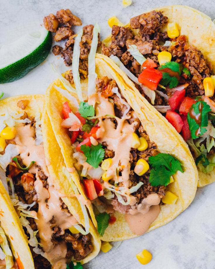 It’s easy to resolve to eat more plant based recipes, but actually doing it is another matter entirely. Here’s one way to make it mega-delicious: Vegan Tacos! They're filled with hearty, spiced walnut taco meat that tastes remarkably similar to the real thing. Add refried beans, your favorite classic toppings, and dollop with a creamy, spicy sauce.