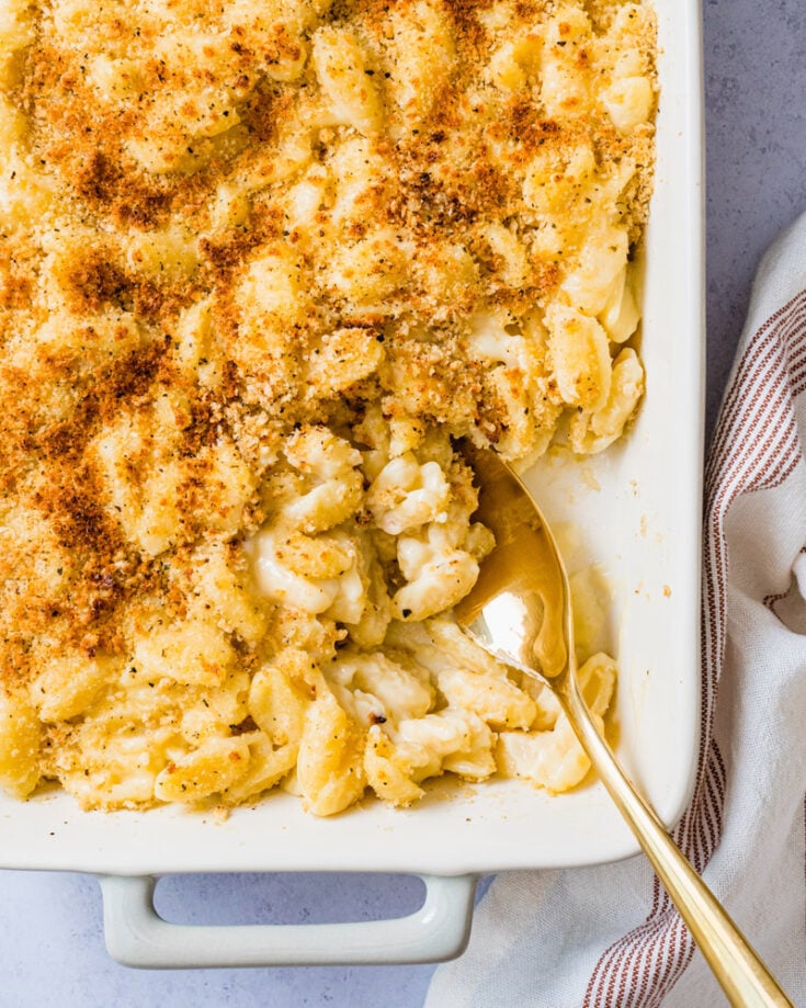 Ready for the best EVER homemade mac and cheese recipe? We promise: it’s really worth pulling out the superlatives here! Making this comfort food from scratch makes it taste infinitely better than the kind from a box. Want to impress everyone? This homemade mac and cheese tastes homey and cozy, with the best gooey, cheesy sauce and crunchy breadcrumbs. Alex and I made this for a recent family gathering and everyone around the table agreed: “this is the best mac and cheese.”