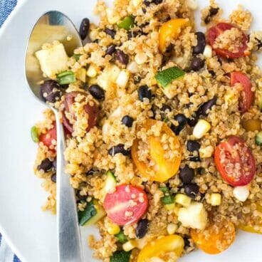 This versatile quinoa salad recipe pairs crunchy veggies with a zingy dressing! It’s ideal as a side dish, for lunches, picnics, and more.