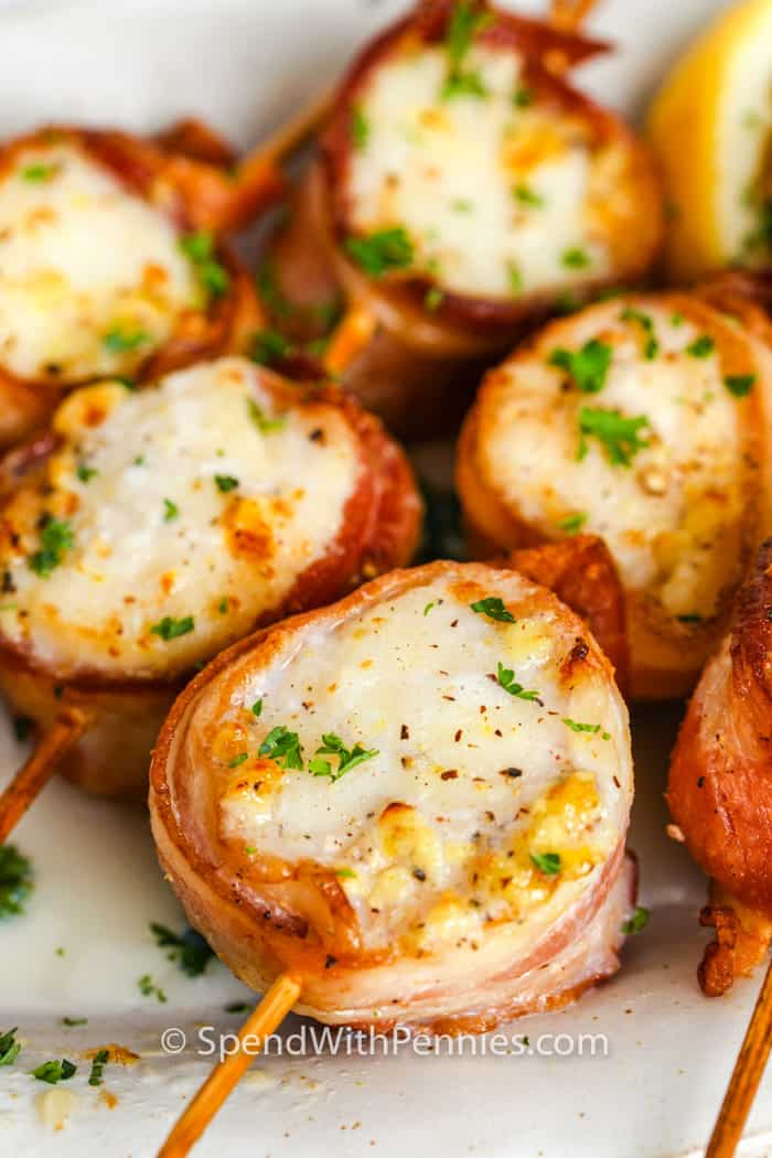 Bacon wrapped scallops work as a stunning appetizer or a main dish. Make them on the grill, broiled, or in the air fryer! The scallops are cooked in a light garlic butter sauce, the bacon adds a smoky salty flavor and the scallops come out perfectly tender.