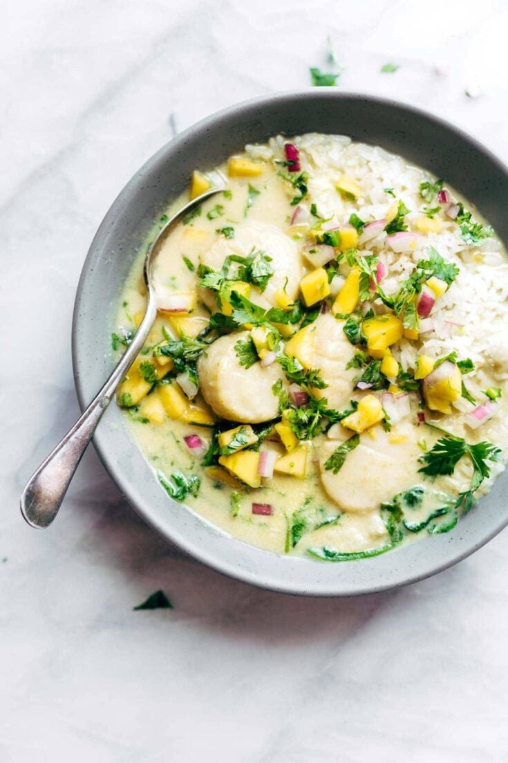 Here's a unique scallop recipe with zingy fresh flavors: Green Curry Scallops! This easy recipe pairs all the best contrasts: bright lime, cool cilantro, and green coconut curry is the perfect antidote to tender, sweet, buttery scallops and fresh mango salsa. via Pinch of Yum