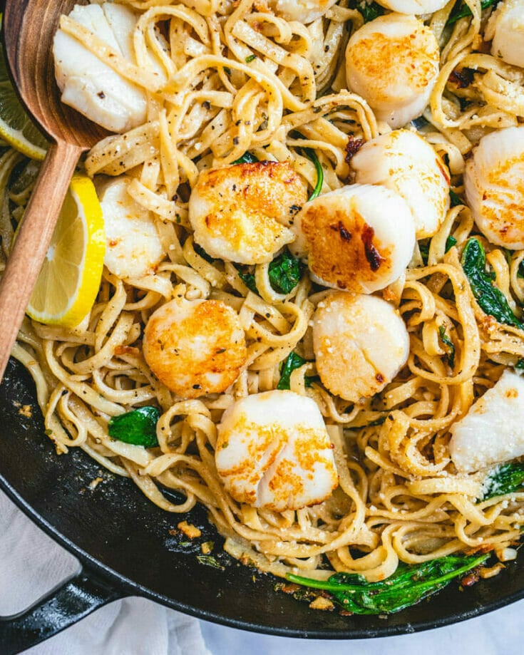 Here’s a stunning scallop recipe that’s elegantly easy to whip up: Scallop Pasta! Whether you want to impress dinner guests, have a romantic dinner, or just feed your family on a weeknight: this recipe is the perfect fit. The seared scallops are sweet, buttery and delicate, set atop tender pasta and accented with flavors of lemon, garlic and herbs.