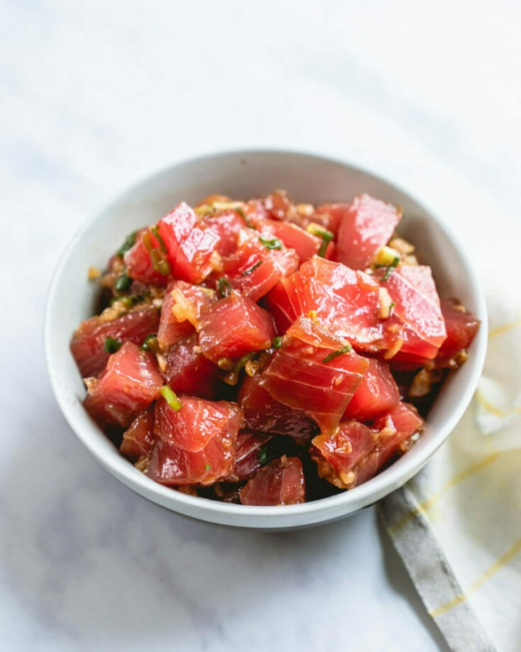 Hawaiian Poke is one of life’s greatest pleasures: and you can eat it without all those bowl components, too! Taking one bite is an explosion in your mouth. You get the silky, buttery texture of the ahi tuna (and you wonder if you actually did bite into butter). There’s the sharp umami of the soy sauce, the crunch of the onion, the pungent ginger, and that sexy garlicky essence…really, there’s nothing like it!