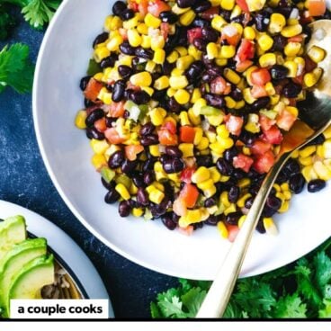 This black bean and corn salad is endlessly versatile! You can serve it for so many different occasions. This might just seem like a simple recipe: but we think it decreases the barriers between you and fresh, plant-forward eating. And for that, we think it’s a genius combination! You can make it into a lunch, dip, or healthy dinner idea like: