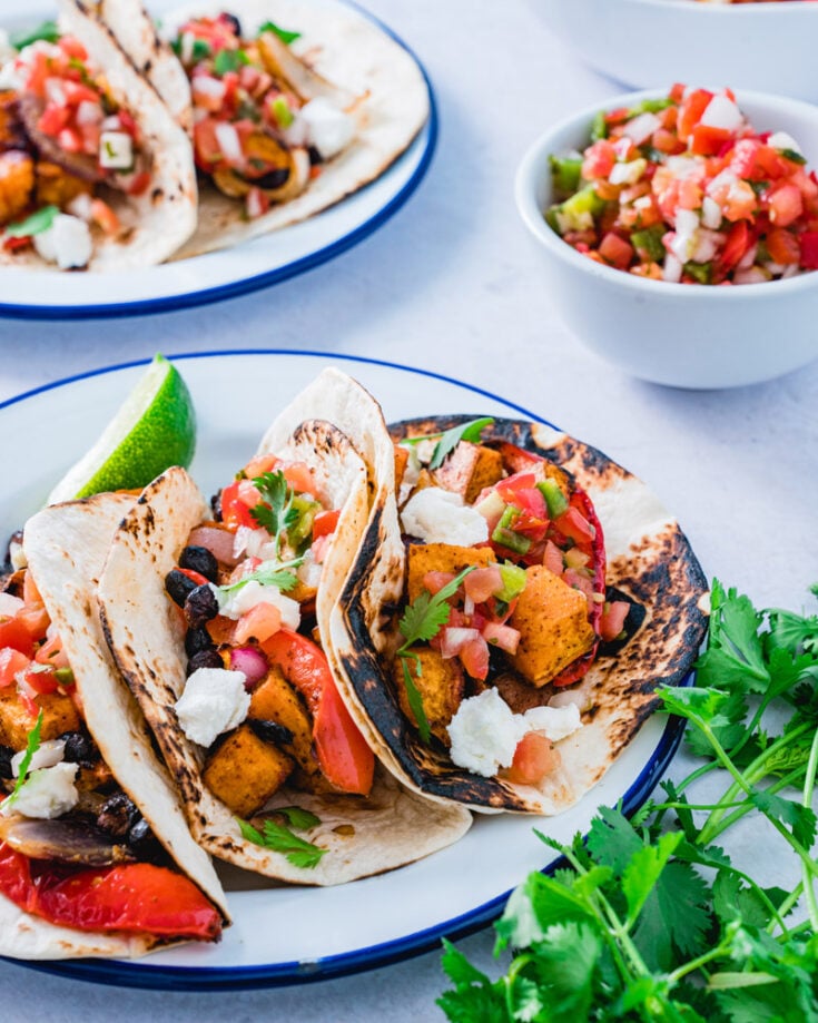 Last up in our fall dinner recipes: these Sweet Potato Black Bean Tacos! Throw almost any seasonal veggies onto a sheet pan, season them up, and they work as a delicious taco filling! The best part: you can add the black beans right on the roasting pan. It comes out zingy and delicious: top with pico de gallo, cheese crumbles, and a dollop of sour cream. Our family couldn’t get enough!