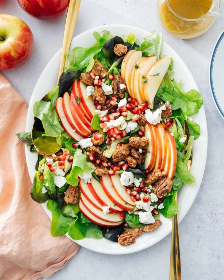 - Place the greens on a large platter or individual plates. Top with apple slices, candied pecans, goat cheese or feta crumbles, and pomegranate seeds or dried cranberries. Top with about 6 tablespoons of the dressing (or more as desired) and serve immediately. (To make ahead, keep all components separate with fresh ingredients and dressing refrigerated. Toss the apples with lemon juice to prevent browning. Bring dressing to room temperature and add all ingredients together directly before serving.)