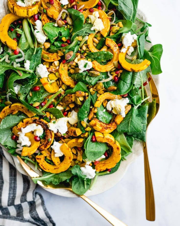 Looking for a stunning fall salad? Enter: this Cozy Fall Squash Salad! This is no ordinary green side salad. This is something special, a hearty and healthy salad perfect for weeknights or parties. Try it with delicata squash, which roasts in just 20 minutes (no peeling required!), or go classic with roasted butternut squash. Add pomegranate seeds, crunchy pistachios, and tangy honey mustard dressing and yep: it’s a stunner.