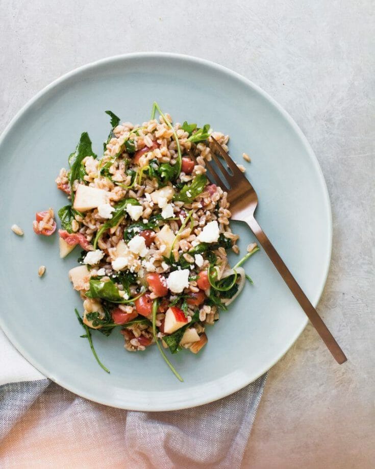 Here's a fantastic fall salad: farro salad with apples! This hearty grain is chewy like barley, but is much quicker to cook. To the farro, add apple, arugula and tart cherries. Sprinkle a bit of feta cheese for a savory saltiness, and then cover the entire farro salad in a tart cherry vinaigrette. With the red and the green, it’s visually stunning, and it tastes incredible: tangy, tart, sweet, and savory all at once.