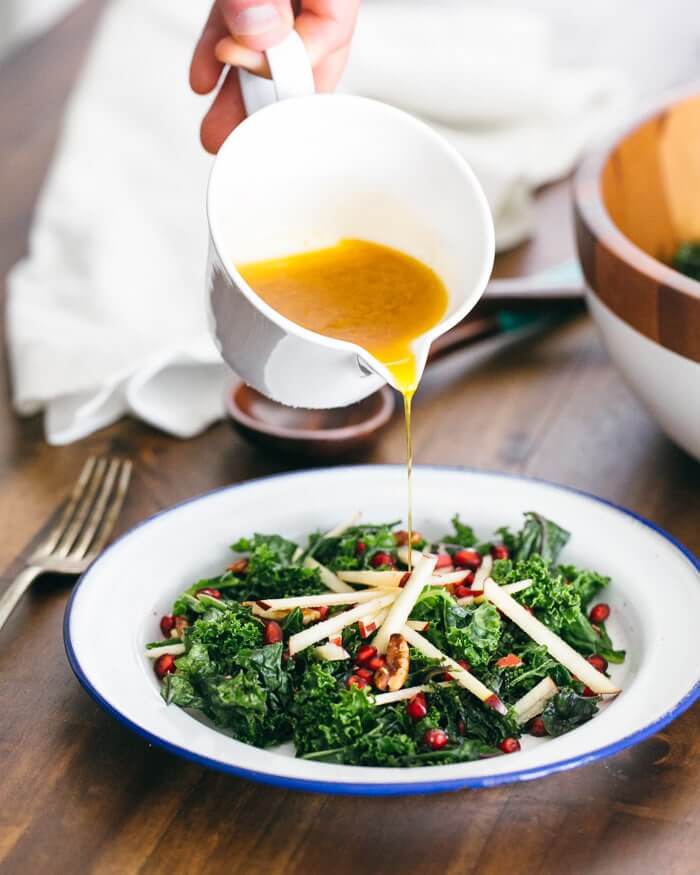 Kale and pomegranate are the perfect fall combination. Here massaging the kale before eating it in this salad makes it taste tender and sweet, instead of bitter! All you do is use a little olive oil and massage the leaves so they become softer. The massaged kale is paired with pomegranate seeds and an apple cider vinaigrette: it’s sweet, tangy, and so, so good.