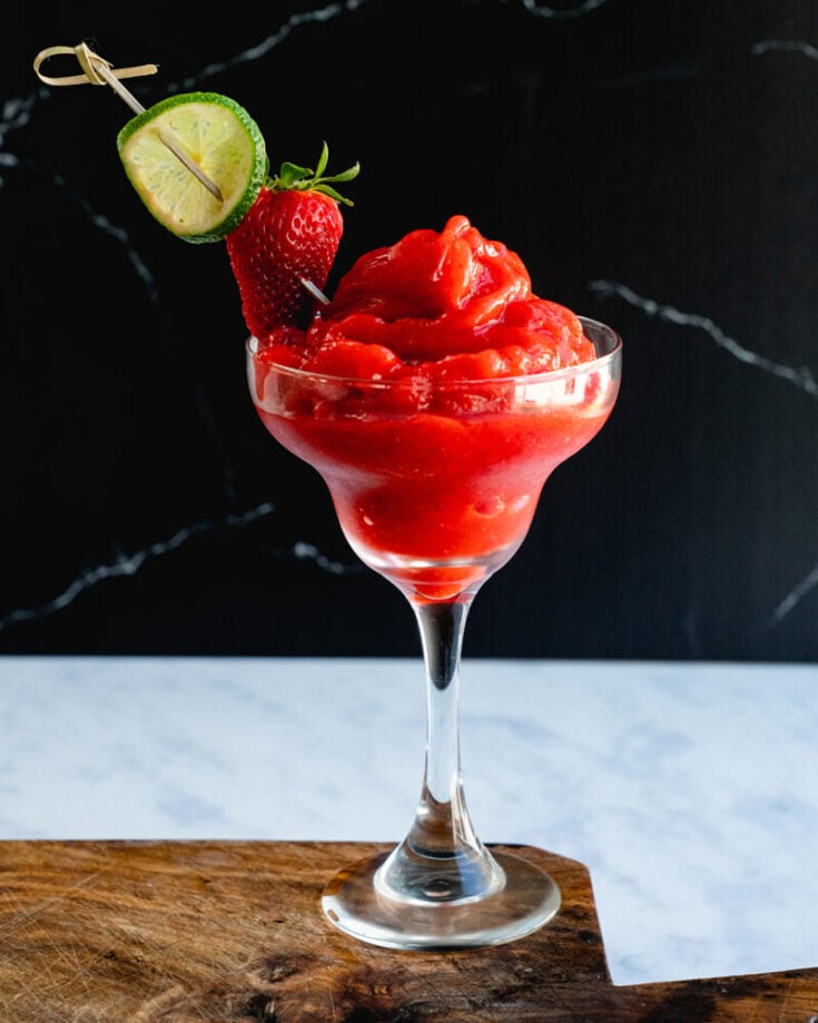 Here’s everyone’s favorite mocktail: the Virgin Strawberry Daiquiri! Hands up: who ordered as a tween to feel sophisticated and grown up? This recipe makes a beautifully fruity version of the classic drink, no rum required. There are a few secrets to avoid tasting like a strawberry smoothie This delicious homemade mocktail is berry-forward, sweet tart and fruity, with a hint of intrigue on the finish.