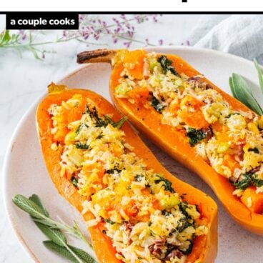This stuffed butternut squash is vegetarian as written in the recipe below, and it’s easily made vegan. Want a meat-based stuffing, or some other ideas? Here are some alternative stuffing ideas: