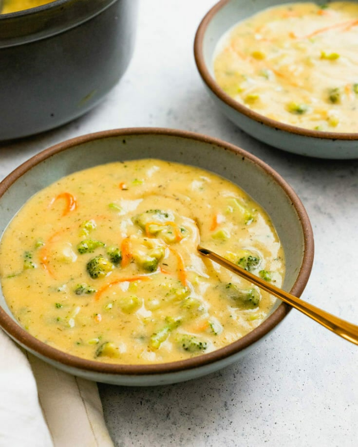 This healthy broccoli potato soup looks like it's cheesy, but it's all an illusion! Blend up cashews with a bit of the soup, and it forms a thick and creamy body that's packed with flavor. Broccoli and carrots add a big dose of nutrients.