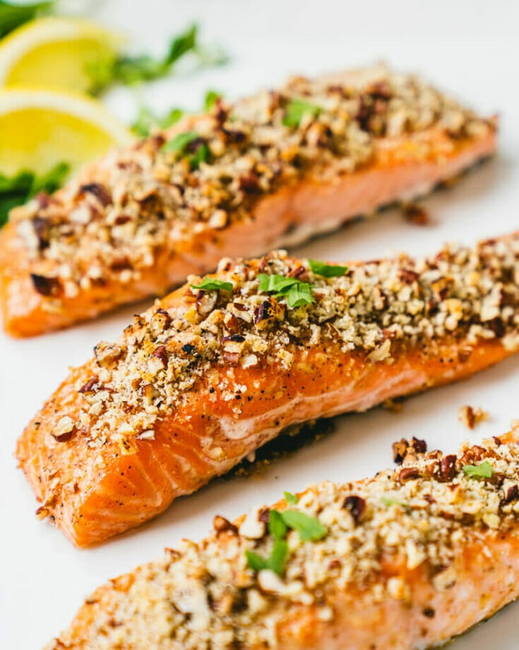 Here’s a meal that consistently makes everyone who takes a bite say Wow. Try this Pecan Crusted Salmon! It has an air of restaurant-style fancy, but it’s fast and easy to whip up on a weeknight. It takes basic salmon to the next level, coating it in a crunchy topping of nuts, seasoned breadcrumbs, and Parmesan cheese. The flavors are elevated enough for dinner guests, but also tasty enough for kids to shovel in bites.