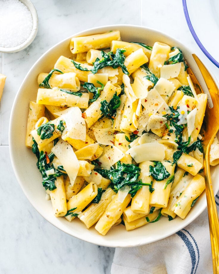 This creamy spinach pasta recipe stars chewy al dente pasta and an irresistible Parmesan garlic cream sauce! The way the creamy sauce and garlic accentuate the leafy greens makes it one of our top vegetarian pasta recipes. Cozy up to a bowl and it’s positively life-giving.