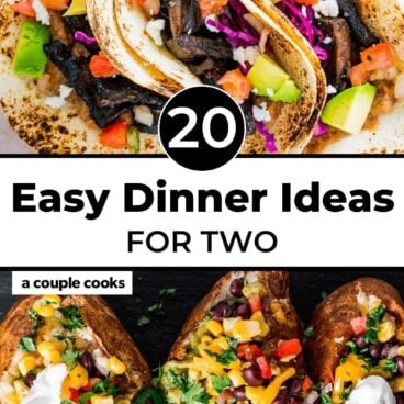 Need mealtime inspiration? If you’re anything like us, we always need new ideas. So we’ve compiled this list of our top easy dinner ideas for two: designed for couples by a couple! Each recipe linked below is easy, healthy and delicious: and easy to scale down or saves well as leftovers. Plan to either make a half recipe or a full recipe and save the leftovers. There are options for seafood, vegetarian, and vegan options. Either way: you’ll be head over heels by these delicious options to cook…together!