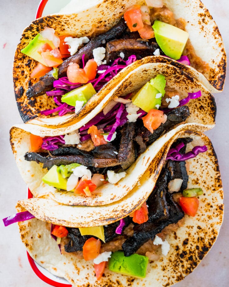 Here’s a quick and easy taco recipe for two: try these Mushroom Tacos! Portobello mushrooms have enormous savory flavor: throw them in a skillet with some punchy seasonings and they make plant-based magic. This recipe is for when you have just a few minutes to throw together a meal: combine those portobellos with creamy refried beans and the quickest slaw, and you’ve got dinner!