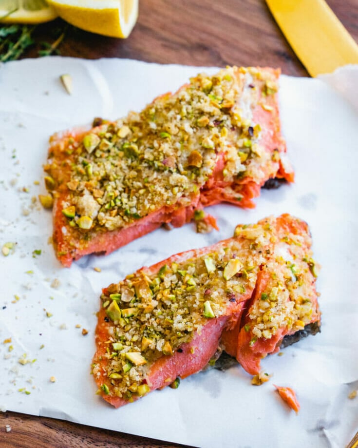 Try this delicious Pistachio Crusted Salmon for Two, or any of the recipes linked above! It’s the perfect easy dinner to impress, topped with a crunchy topping of nuts and Parmesan cheese.