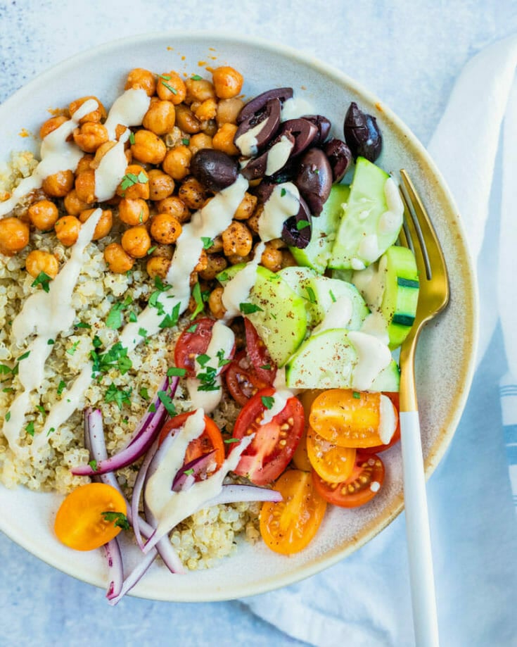 A good grain bowl is an easy vegetarian dinner! This one is loaded with fresh veggies, chickpeas and our favorite creamy Tahini Sauce. It makes a fast and easy dinner in 30 minutes!