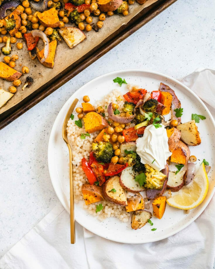 Here's a vegetarian sheet pan dinner to load on the veggies! This recipe has 4 of our best vegetables to eat all at one time: and it’s seriously tasty, too. It’s perfect to meal prep for healthy dinners or lunches throughout the week.