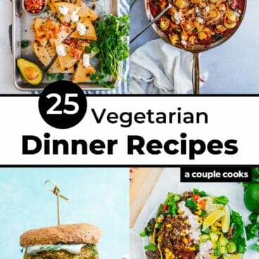 Here are our top 25 vegetarian dinner recipes! These recipes are filled with colorful healthy veggies and enough plant-based protein to keep you full. All of them have received top marks from readers, and remain in our short-list for regular cooking, too. Ready to get started?