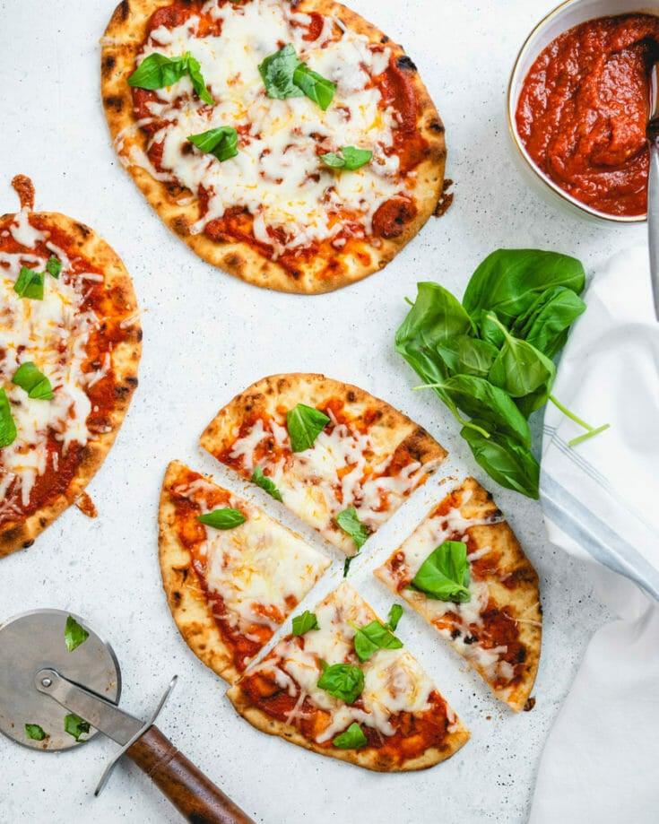 Here’s our ultimate fast and easy recipe: Naan Pizza! Get this: it’s faster than delivery pizza, healthier, and it tastes better. So why order out when you can make tasty pizza in? It’s for those nights where you need dinner on the table without thinking too hard. Packaged naan bread is easy to find these days, making it easy to run to the store on a naan pizza run.
