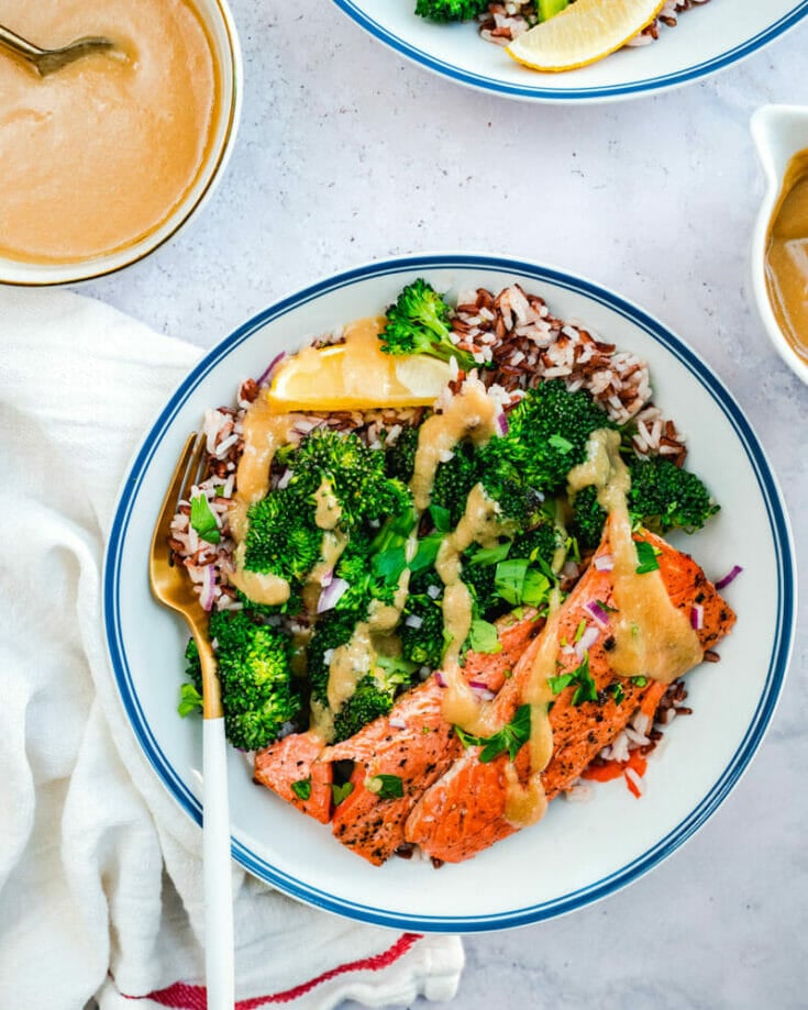 Next up in our easy recipes: the Salmon Bowl! Here tender, seasoned fish is offset with rice, crisp tender broccoli, and covered in an easy, creamy flavor popping sauce. Use smoked salmon for super simple prep! Try the Tahini Dressing or Miso Dressing, and prepare to be amazed.