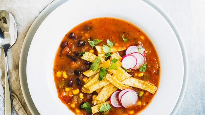This vegetarian tortilla soup is so flavorful and quick! It’s an easy healthy soup recipe from the popular Pretty Simple Cooking cookbook.