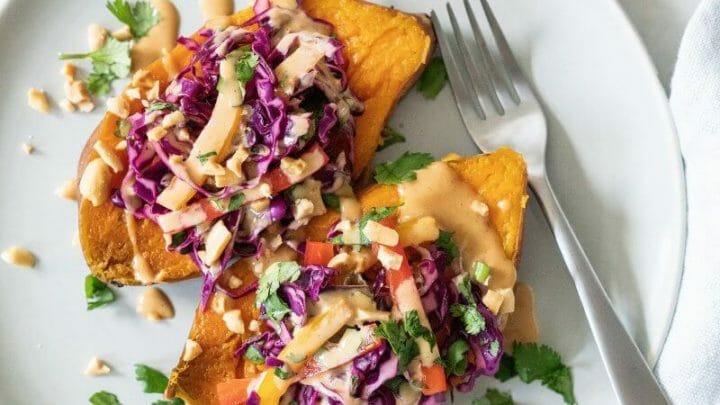 These sweet potatoes topped with a zesty slaw and creamy Thai peanut butter sauce are an irresistible plant based dinner recipe!