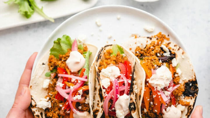 These loaded quinoa tacos are a delicious vegetarian taco recipe, featuring quinoa taco filling, bell pepper slaw, spicy sour cream, and feta!