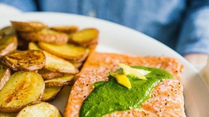 Short on time? This 10-minute baked salmon recipe is an ultra quick dinner, paired with a bright green chimichurri sauce.