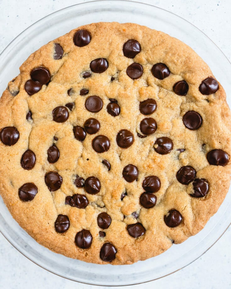 Who doesn't want a chewy cookie cake in their lineup of baking recipes? This one is 100% more delicious than a store bought cookie cake. The dark chocolate chunks and a hint of orange zest make it seriously irresistible: the flavor is oh so real. And the texture: perfectly soft and chewy. It's a total crowd pleaser and perfect for celebrations. Also try: Chocolate Chip Almond Flour Skillet Cookie