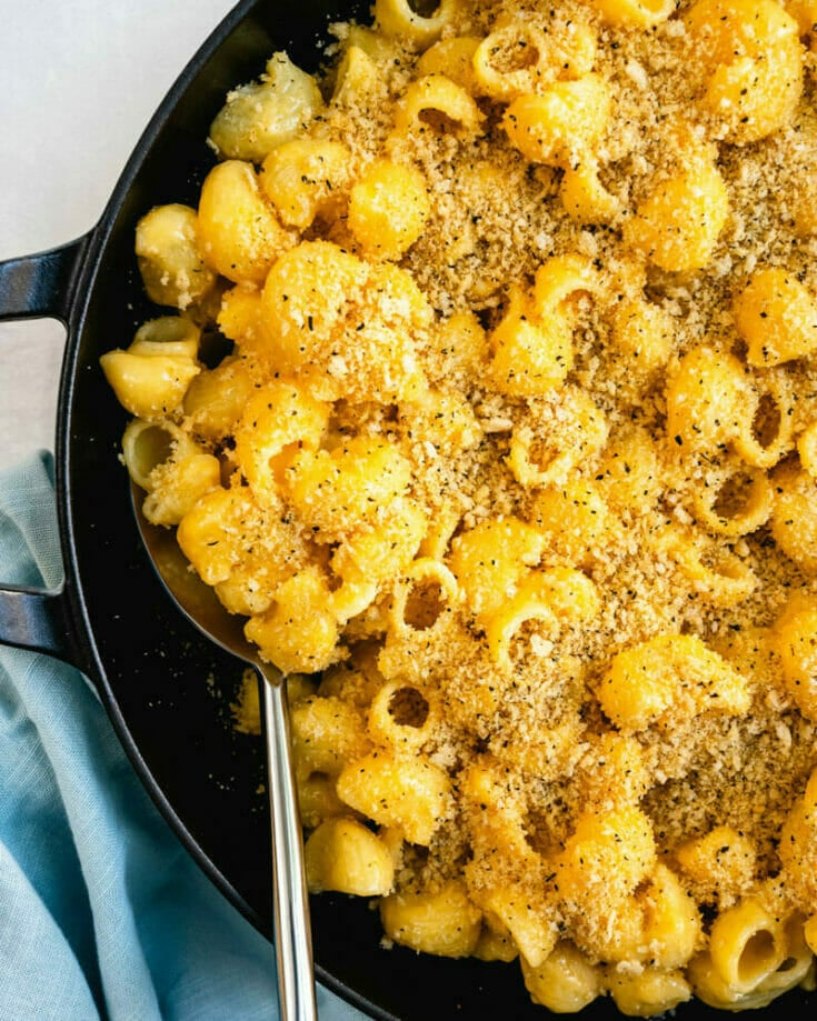 Ready for the best EVER homemade mac and cheese recipe? We promise: it’s really worth pulling out the superlatives here! Making this comfort food from scratch makes it taste infinitely better than the kind from a box. Want to impress everyone? This homemade mac and cheese tastes homey and cozy, with the best gooey, cheesy sauce and crunchy breadcrumbs. Alex and I made this for a recent family gathering and everyone around the table agreed: “this is the best mac and cheese.”