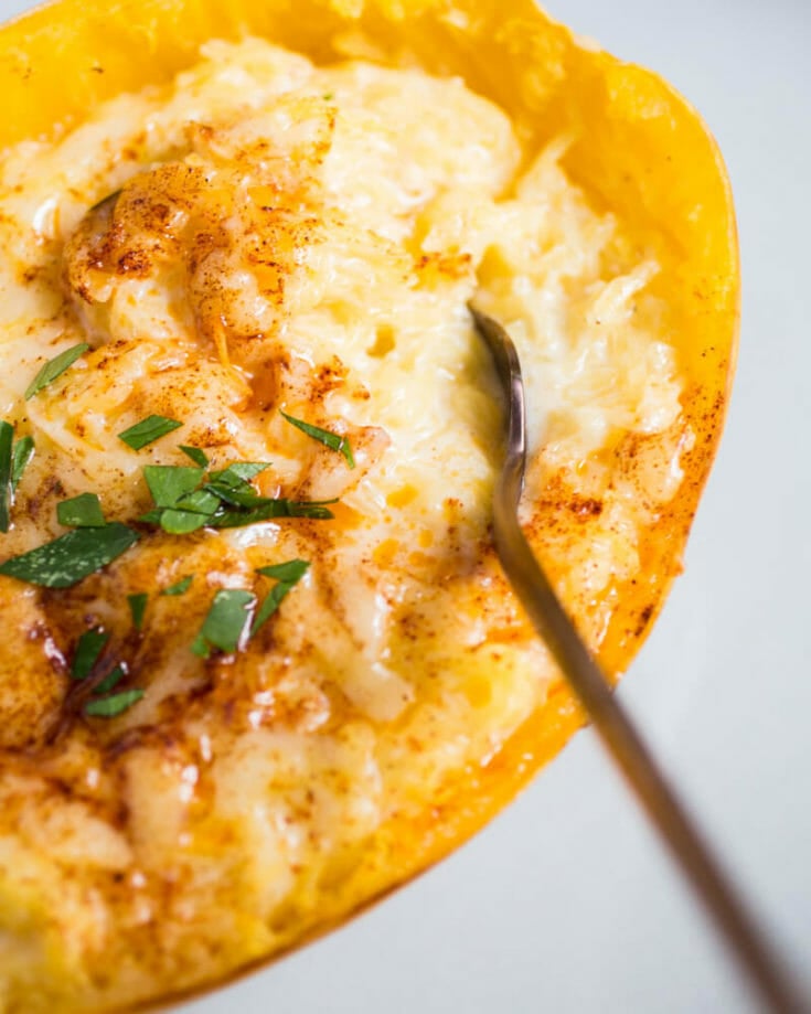 Here's a unique mac and cheese recipe: spaghetti squash mad and cheese! It's just as comforting and homey as it sounds. The spaghetti squash noodles are mixed with a creamy cheesy Béchamel sauce made with Gruyere cheese, a pinch of nutmeg and a dash of white wine. It sounds fancy, but at its core: it's comfort food at its finest. Roasting or pressure cooking spaghetti squash transforms its interior into long, slender "noodles." You can even use the squash shell as a serving dish!