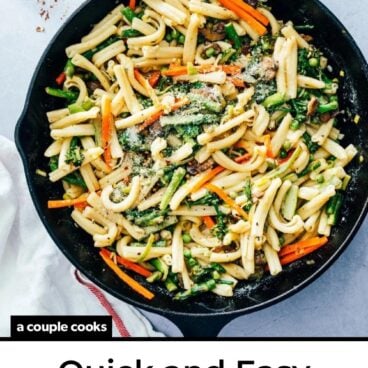 Since then, Pasta Primavera has popped up on restaurant menus across the globe, popularly at Italian American chains like Olive Garden. There’s really no “correct” way to make this dish: no specifications on the exact sauce or the type of vegetables. Primavera means spring in Italian, so often you’ll see it with spring vegetables like asparagus and carrot. But just as many spins use summer vegetables like zucchini and tomatoes: so there’s a lot of variation!
